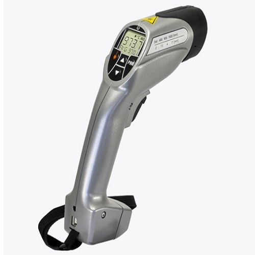 2:IS 8 pro 高速手持式红外测温仪,用于金属和陶瓷的温度测量。光斑极小,最大值存储,温度显示。温度范围600...2500℃,波长0.78...1.1 μm,视域比最小光斑尺寸直mm min 500:1 (min 0.5,响应时间t90 1 ms,输出USB。