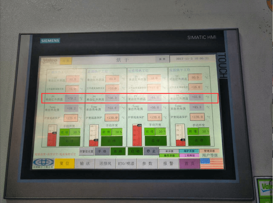 橡胶条经过加工后需要经过:正面预热——正面烘干——反面预热——反面烘干,四道工序,每一步度需要进行温度监控(有红外测温,热电偶测温)。